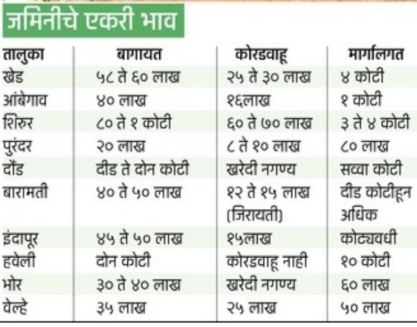 तर बारामती, इंदापूर, दौंड, हवेलीसह अन्य तालुक्यातील बागायती जमिनीला 40 लाखापासून ते दीड ते दोन कोटी रुपये एकर भाव मिळत आहे. दिवसेंदिवस या भावांमध्ये वाढ होत चालली असून हवेली तालुक्यातील परिसरात तब्बल 10 कोटींपर्यंत दर पोहचला आहे