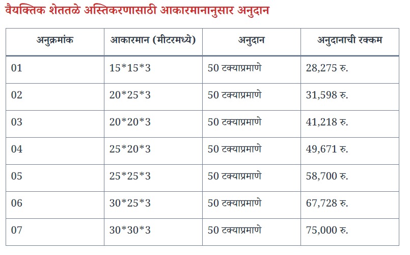 शेततळयाच्या अनुदानाची रक्कम आकारमानानुसार निश्चित करण्यात आली आहे. तथपि देय अनुदानाची कमाल रक्कम रुपये 75 हजार रुपये इतकी राहील,