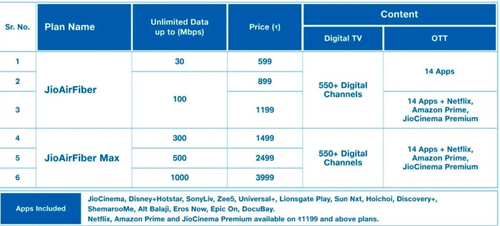 जर आपण Jio Air Fiber प्लॅनबद्दल बोललो तर तुम्हाला 6 किंवा 12 महिन्यांचा प्लान घ्यावा लागेल. ज्यामध्ये तुम्हाला Jio Air Fiber 5G डिव्हाइस मोफत दिले जाईल. तुम्ही 599 रुपयांच्या किमान रिचार्जसह प्लॅन घेतल्यास, तुम्हाला 30 दिवसांची व्हॅलिडिटी मिळेल. आणि 30 mbps चा अमर्यादित 5G डेटा उपलब्ध आहे. इतर जिओ प्लॅनचे डिटेल्स खाली दिलेल्या टेबलमध्ये पहा..
