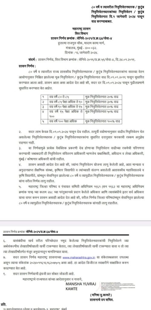 वय वर्ष 80 ते 85 वयोगटातील पेन्शनधारकांना मूळ निवृत्तीवेतनाच्या 20 टक्के वाढ, 85 ते 90 वयोगटासाठी 30 टक्के, 90 ते 5 वयोगटासाठी 40 टक्के वाढ, 95 ते 100 वयोगटासाठी 50 टक्के वाढ तर 100 वर्षांपेक्षा अधिक वयाच्या पेन्शनधारकाला मूळ निवृत्तीवेतनाच्या 100 टक्के म्हणजेच दुप्पट पेन्शन देण्याचा निर्णयाचा शासन निर्णय वित्त विभागाने जारी केला..
