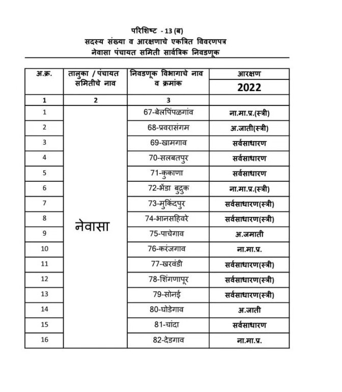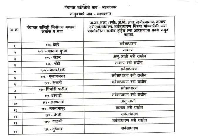 अहमदनगर जिल्ह्यातील पंचायत समिती गणाचे आरक्षण, पहा :-